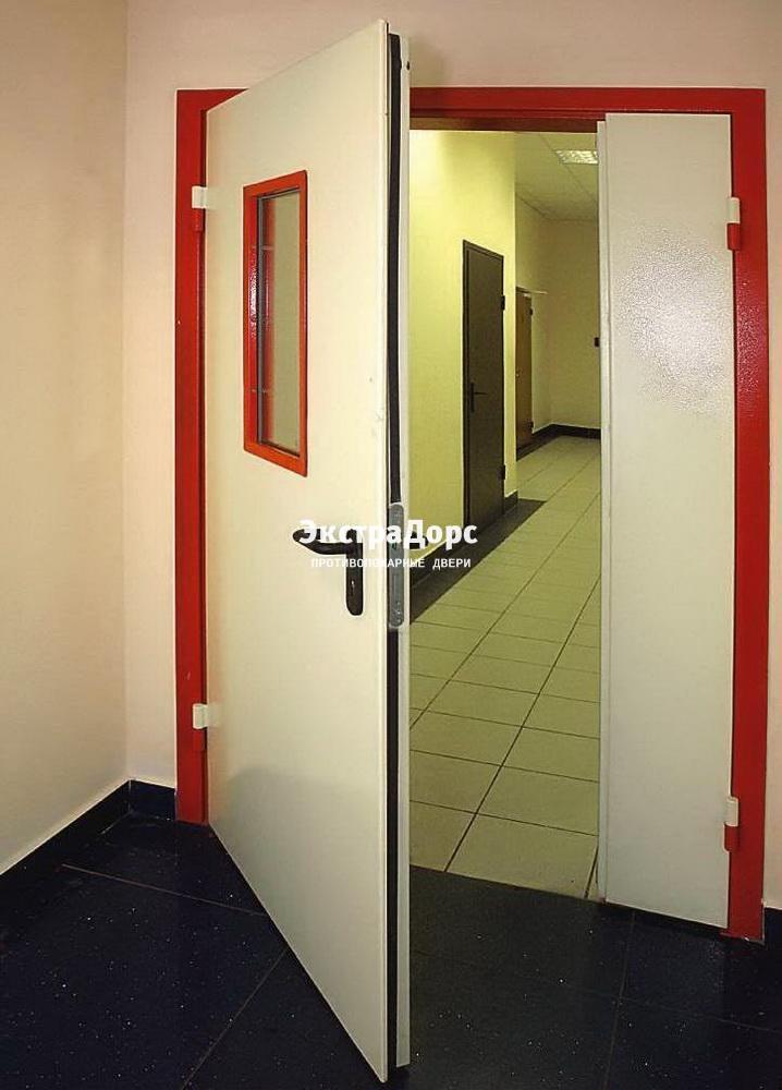 Дверь противопожарная без порога полуторная с квадратным стеклом