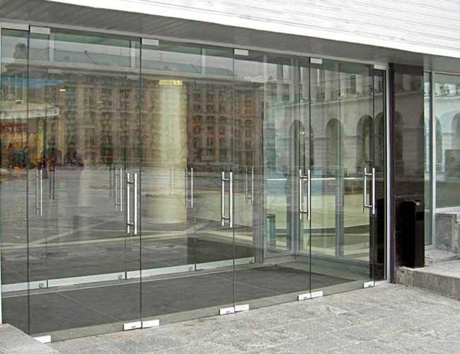 Противопожарная безрамная дверь со стеклом в торговый центр в Раменском